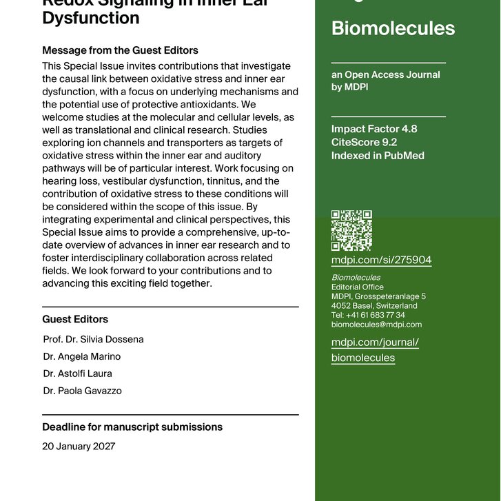 March 24, 2026: Special issue on oxidative stress and hearing loss in the journal Biomolecules